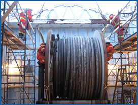 On November 3, 2008, a fire hit the surface of a cable shaft at the Churchill Falls 5,428 MW hydroelectric facility in Labrador, Canada. The fire damaged the 245 kV power cables connecting the underground transformers to transformers on the surface. Two of the 11 generating units at the facility became inoperable. This resulted in a reduction in generating capacity available. At the request of the owner of the facility, EHV Power’s personnel flew to the facility on the evening of the fire to assess the damage. RGP (Residual Gas Pressure) analysis on the spare LPOF (Low Pressure Oil Filled) cable reels commenced the next day. A day-by-day project schedule was prepared to remove the damaged cables from the tunnel and shaft. Installation of new cables began immediately after the removal. One of the two disabled generators returned to service just two and half months after the fire. Repairs to allow the second unit to return to service occurred in the summer of 2009 upon the arrival of new underground high voltage cable materials.